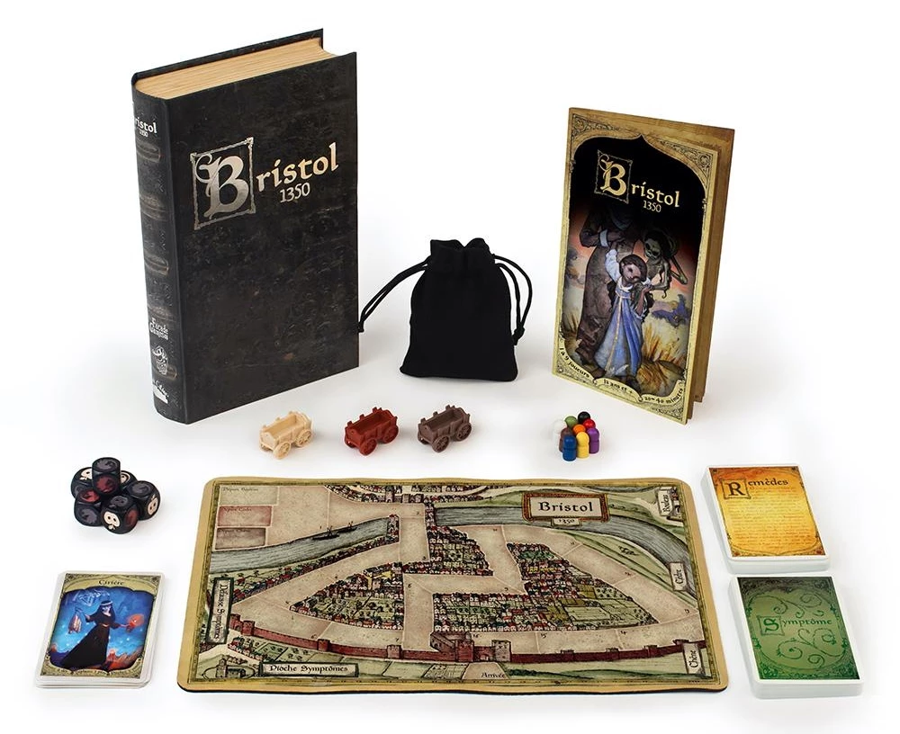 En apparence, Bristol 1350 est à la fois un jeu d’équipe coopératif, une stratégie de course et une déduction sociale. En réalité, il s’agit d’une course égoïste pour quitter la ville le plus rapidement possible sans attraper la peste, par tous les moyens !
