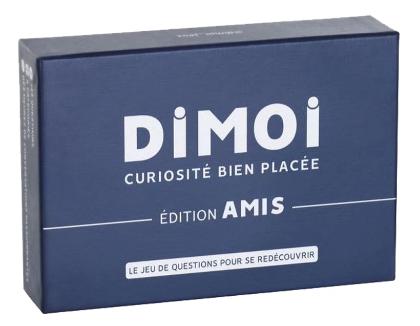 Découvrez le jeu DIMOI édition amis, un jeu de cartes avec 144 questions pour échanger, connaître et se redécouvrir entre amis. Quatre catégories de questions soigneusement conçues aux sujets variés et originaux composent cette édition: «Connexions», «Crunch », «Authentique» et «Hors-piste ». Des questions qui suscitent une prise de recul, de la réflexion, des émotions, des rires… Chaque question est là pour faire grandir nos amitiés.