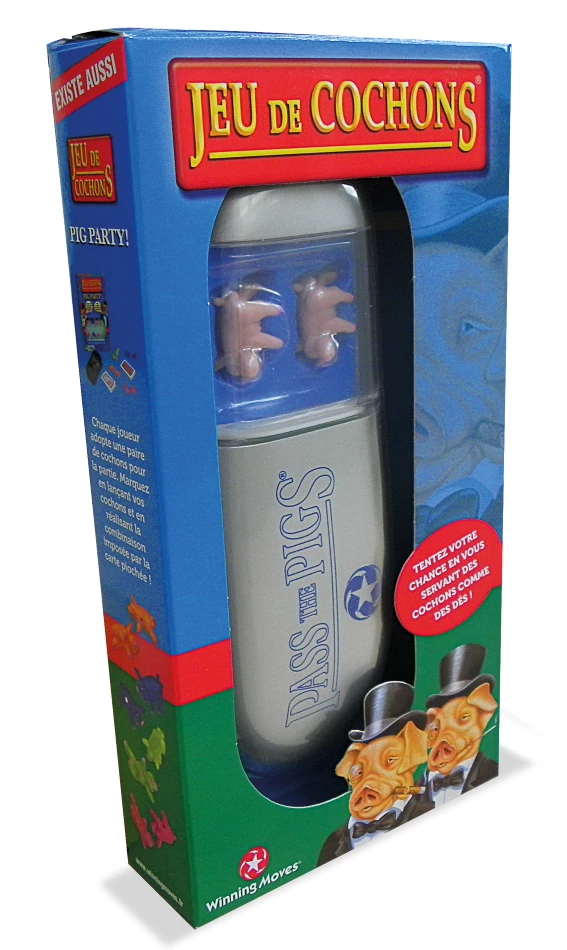 Les cochons remplacent les dés. Lorsqu’on les lance, ils retombent dans n’importe quelle position (sur le dos, sur le groin, sur une oreille, sur 2 pattes, sur 4 pattes…). Chaque position rapporte un certain nombre de points. On accumule les points…mais certaines positions peuvent annuler les points acquis.